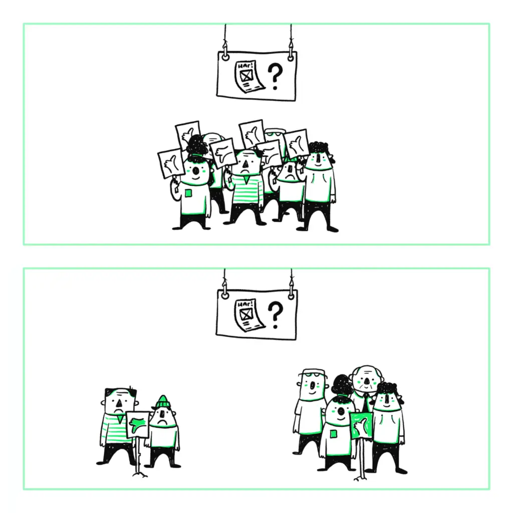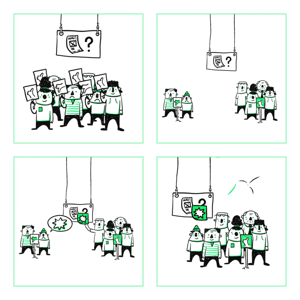 The secret is that everyone takes a position on possible decision scenarios, which is immediately visible to everyone. This makes it possible to listen to those people who bring a valuable additional perspective and not waste time with unproductive discussions.
